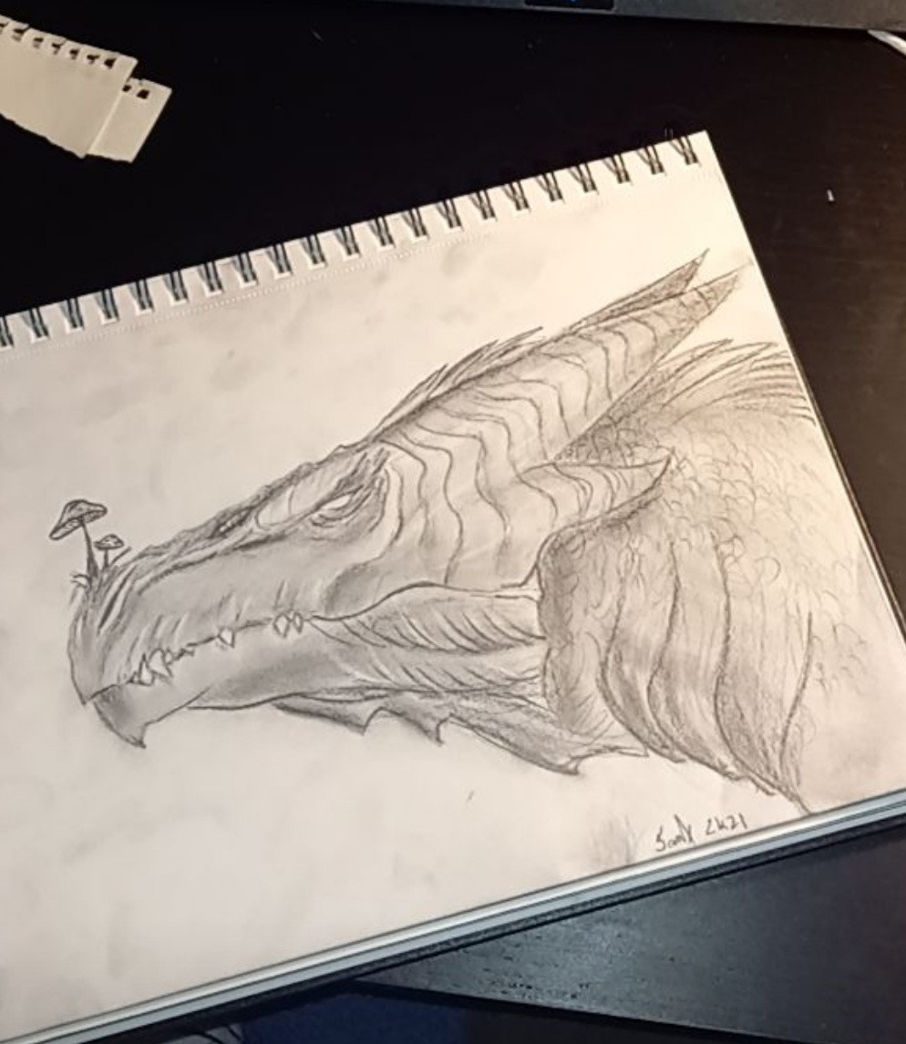 Kuvassa ylhäällä piirtämäni lohikäärme vuonna 2021. Tyyli oli vähän hakusessa, eikä tämä ole parhaita töitäni, mutta yksi lemppareistani. Alempana näet muutaman piirroksen/maalauksen ja muutaman käsityöni.